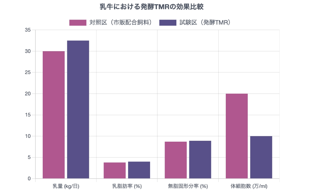 発酵TMRは乳牛においても大きな効果を発揮します。乳量が増加するだけでなく、乳脂肪率や無脂固形分率といった乳質も向上。さらに、乳房炎の指標となる体細胞数が減少し、牛の健康状態が改善されることも報告されています。