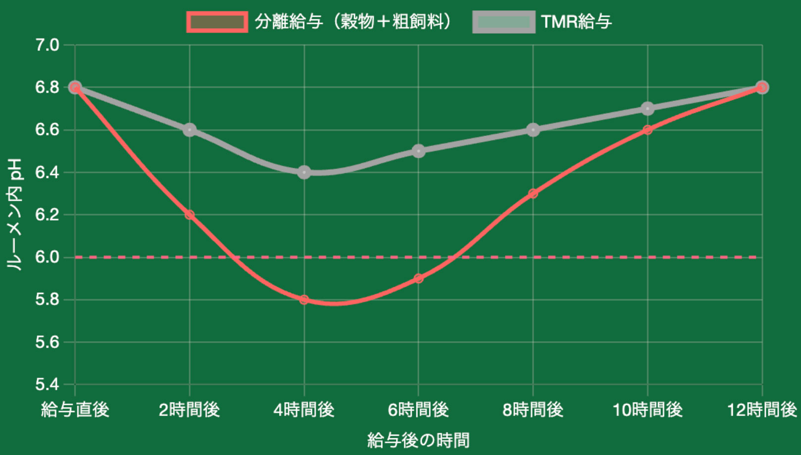 穀物だけを一度に食べるとルーメン内が急激に酸性化(アシドーシス)し、微生物の活動が低下します。TMRは粗飼料と混合されているため、唾液の分泌を促し、pHの急激な低下を防ぎます。