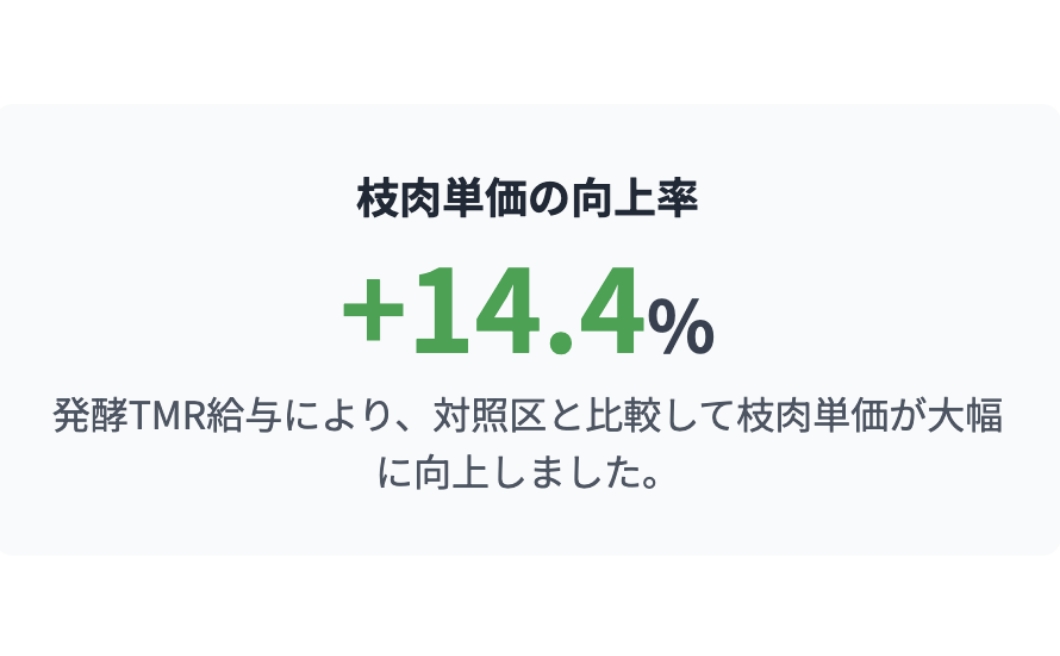 発酵TMRを給与した黒毛和種は、市販配合飼料を与えた対照区の牛と比較して、収益性に直結する枝肉単価で優れた結果を示しました。