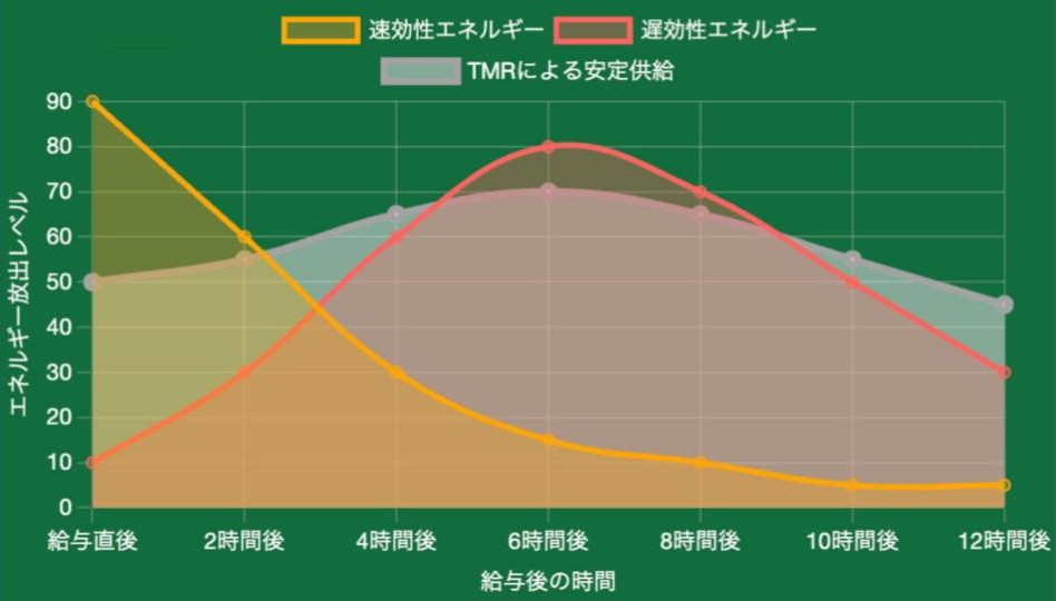 分解の速い穀物(でんぷん質)と、遅い粗飼料(繊維質)を組み合わせることで、エネルギーが持続的に安定供給され、微生物の活動を最適化します。