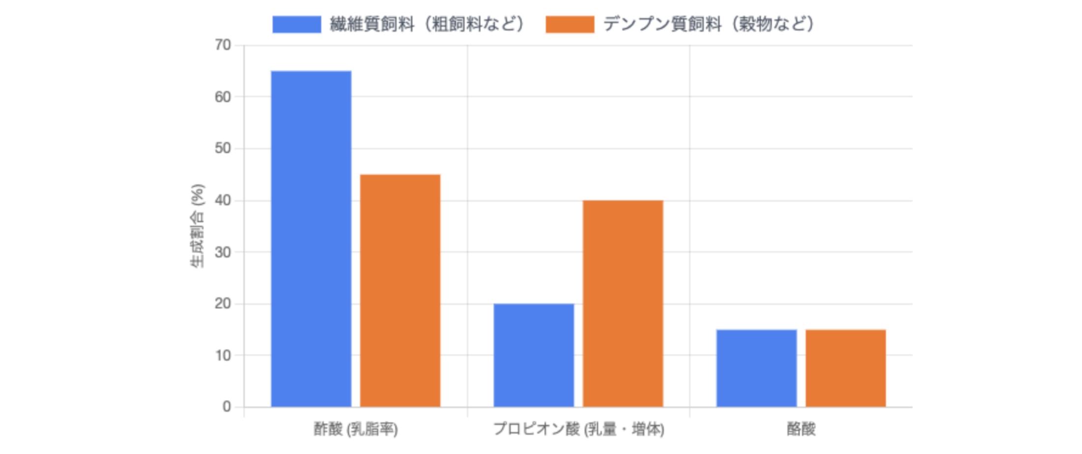 酢酸:主に粗飼料(牧草など)から作られ、乳脂肪の主要な原料となります。