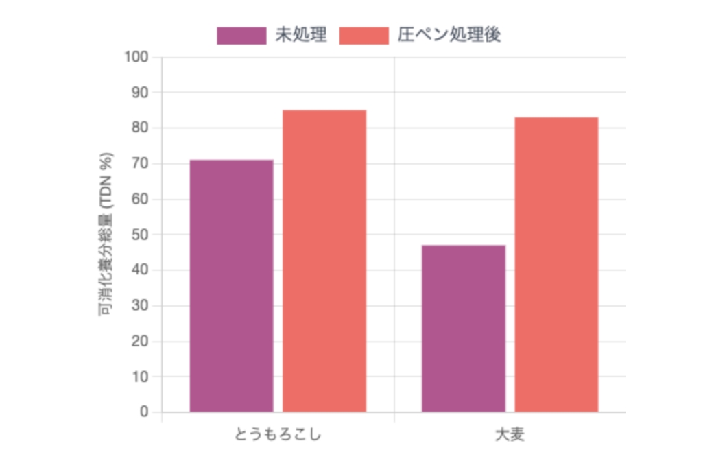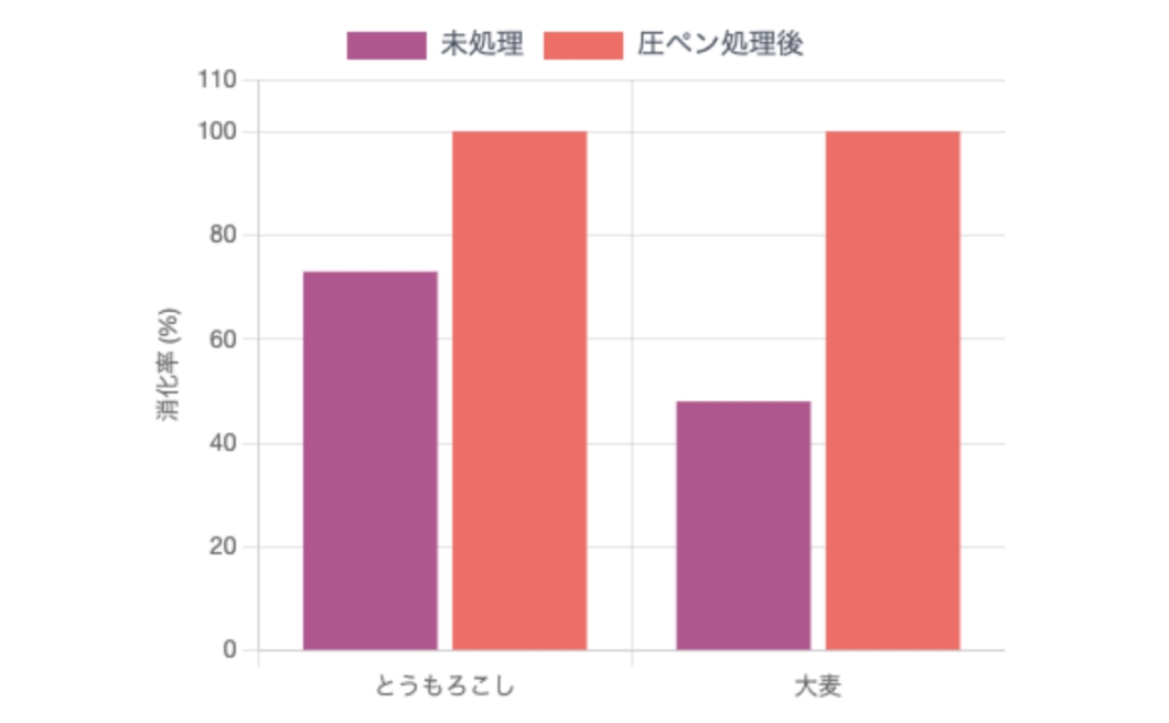 圧ペン処理により、とうもろこし、大麦ともに消化率が100%近くまで向上します。