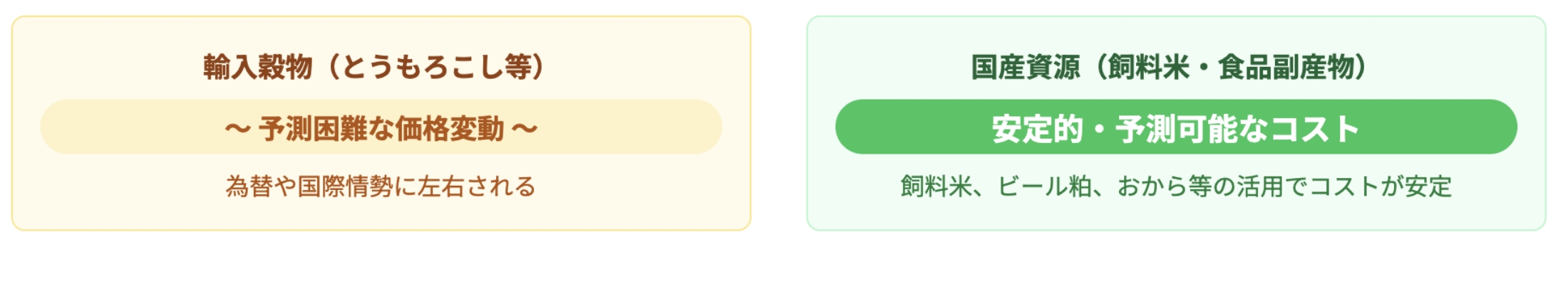 国内の未利用資源を活用し、高価な輸入飼料への依存を減らすことで、価格変動リスクに強い経営を実現します。